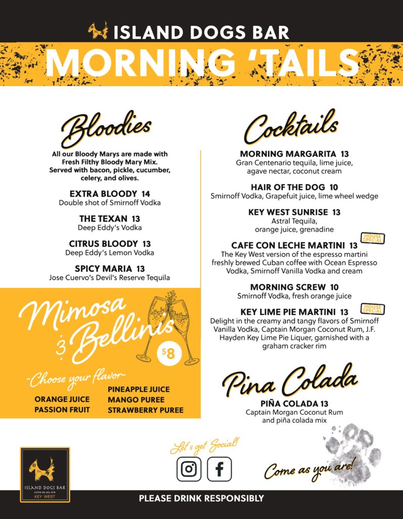 BREAKFAST DRINKS Your Favorite Spot in Key West is Just a Bone’s Throw Away! (305) 509-7136 505 Front StreetKey West, FL 33040 Open Daily!